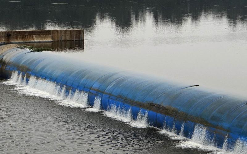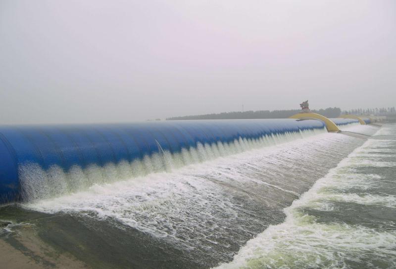 充氣橡膠壩,是用高強度合成纖維織物做受力骨架,內外涂敷橡膠作保護層,加工成膠布,再將其錨固于底板上成封閉狀的壩袋,通過充排管路用水(氣)將其充脹形成的袋式擋水壩。壩頂可以溢流,并可根據需要調節壩高,控制上游水位,以發揮灌溉、發電、航運、防洪、擋潮等效益。
