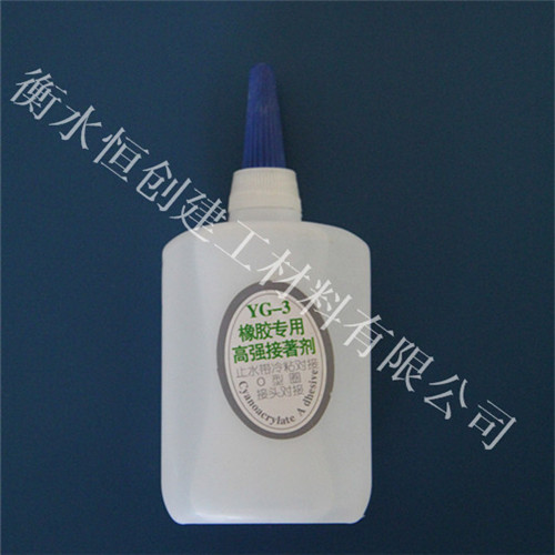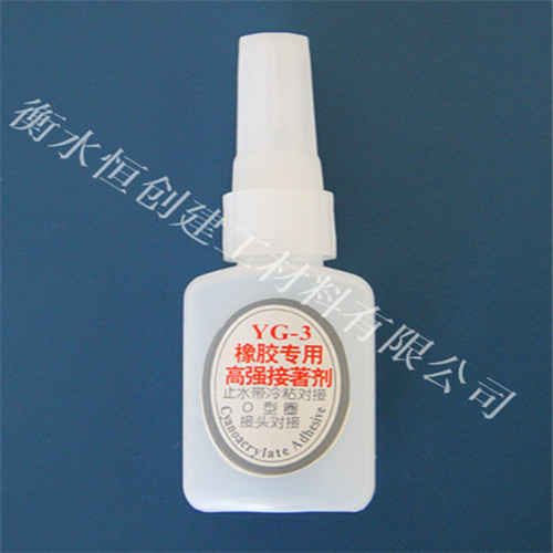 2.橡膠止水帶接頭用膠水YG-3是我公司專業開發的橡膠止水帶膠水、一款用于橡膠(包括天然橡膠、丁晴橡膠、氯丁橡膠、三元一丙膠等)、金屬及塑料之間相互粘接的樹脂型環保膠粘劑。外觀為透明流動液體,單組份,常溫下吸潮固化,初步定位時間一般為5-10min, 產品完全固化時間一般為24-48小時(室溫25℃)。
